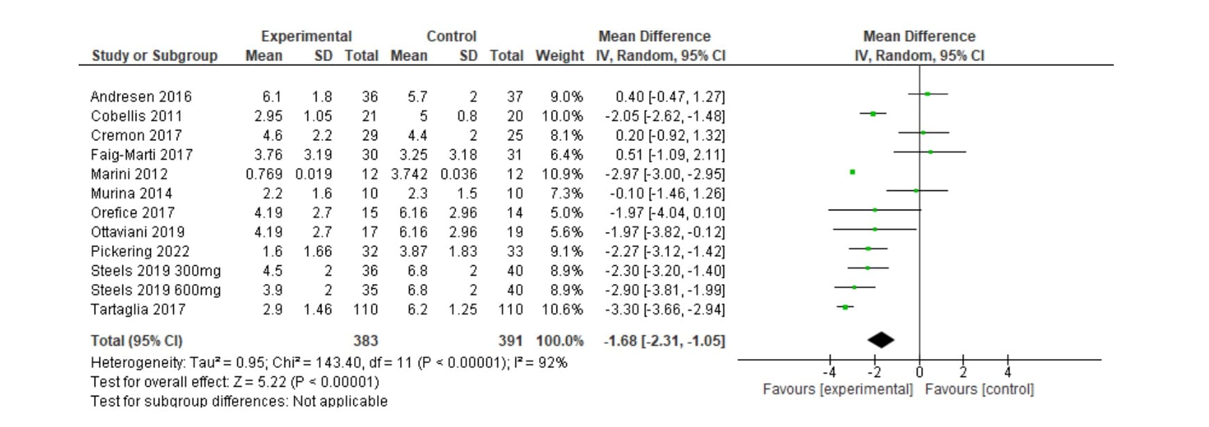 PEA zeigte in der gepoolten Analyse eine signifikante Reduktion der Schmerzintensität im Vergleich zu Placebo oder aktiver Kontrolle (mittlere Differenz: −1,68; 95 % CI: −2,31 bis −1,05; p = 0,00001). Diese Wirkung war konsistent über verschiedene Indikationen und Populationen hinweg, wenngleich die Heterogenität hoch war (I² = 93 %).