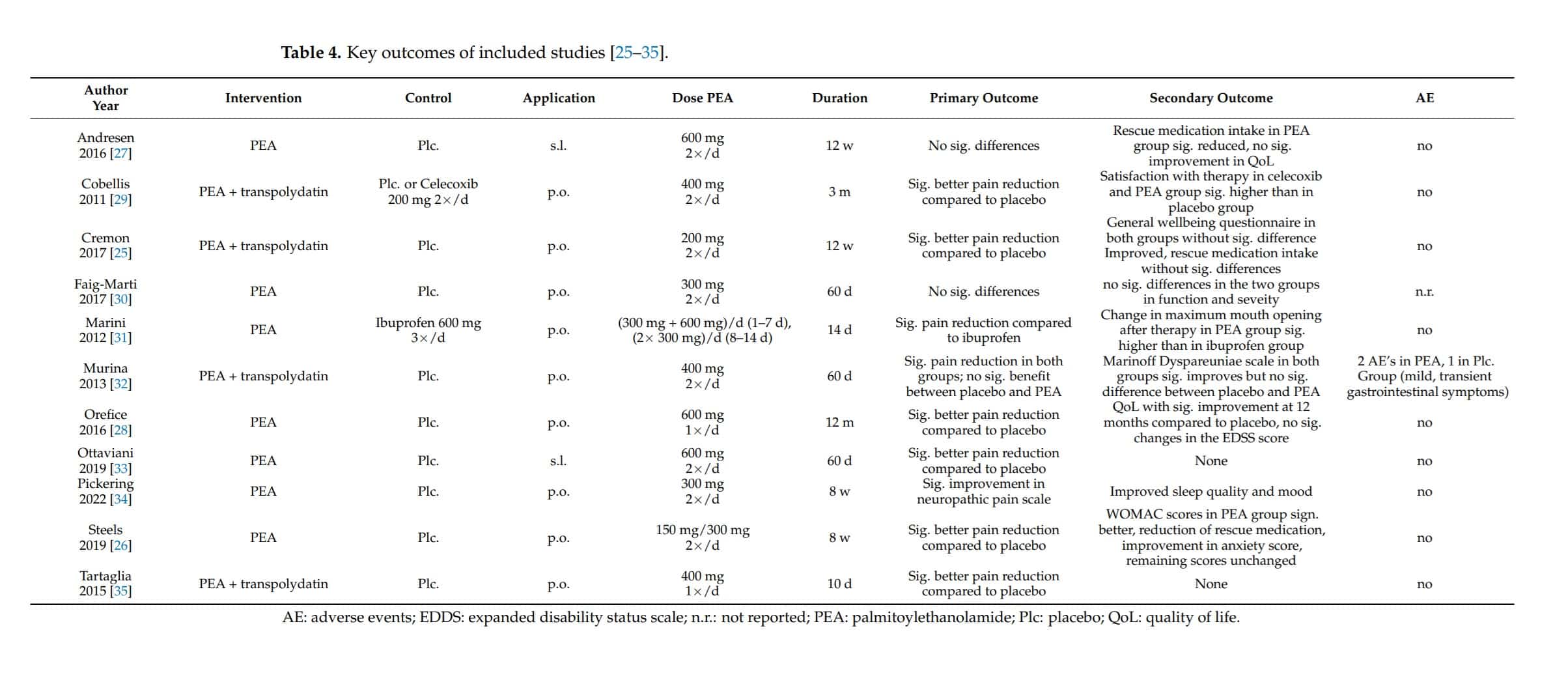 Einige methodische Unterschiede (z. B. Mikronisierung des Wirkstoffs, Dosierung und Behandlungsdauer) erschweren direkte Vergleiche. In zwei Studien war PEA nicht wirksam, was möglicherweise mit zu niedriger Dosierung oder methodischen Schwächen zusammenhängt. Dennoch blieb in der Gesamtschau der Nutzen von PEA klar erkennbar.