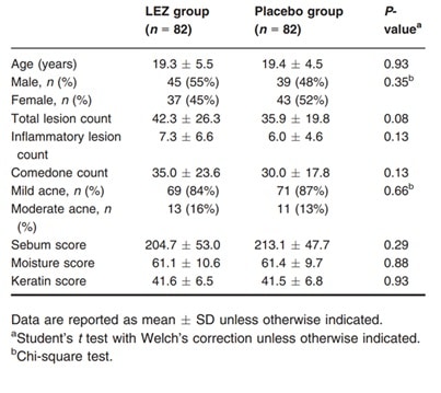 Es wurden 168 gesunde Personen (13–40 Jahre) mit milder bis mittelschwerer Akne eingeschlossen. Ausschlusskriterien waren unter anderem aktuelle Akne Therapien, hormonelle Verhütung, Schwangerschaft, Stillzeit, Immunsuppression, onkologische Erkrankungen in den letzten fünf Jahren, Diabetes, Gefäßerkrankungen, Hepatitis, Ekzeme, Psoriasis oder Allergien gegen Bestandteile der Studienmedikation.