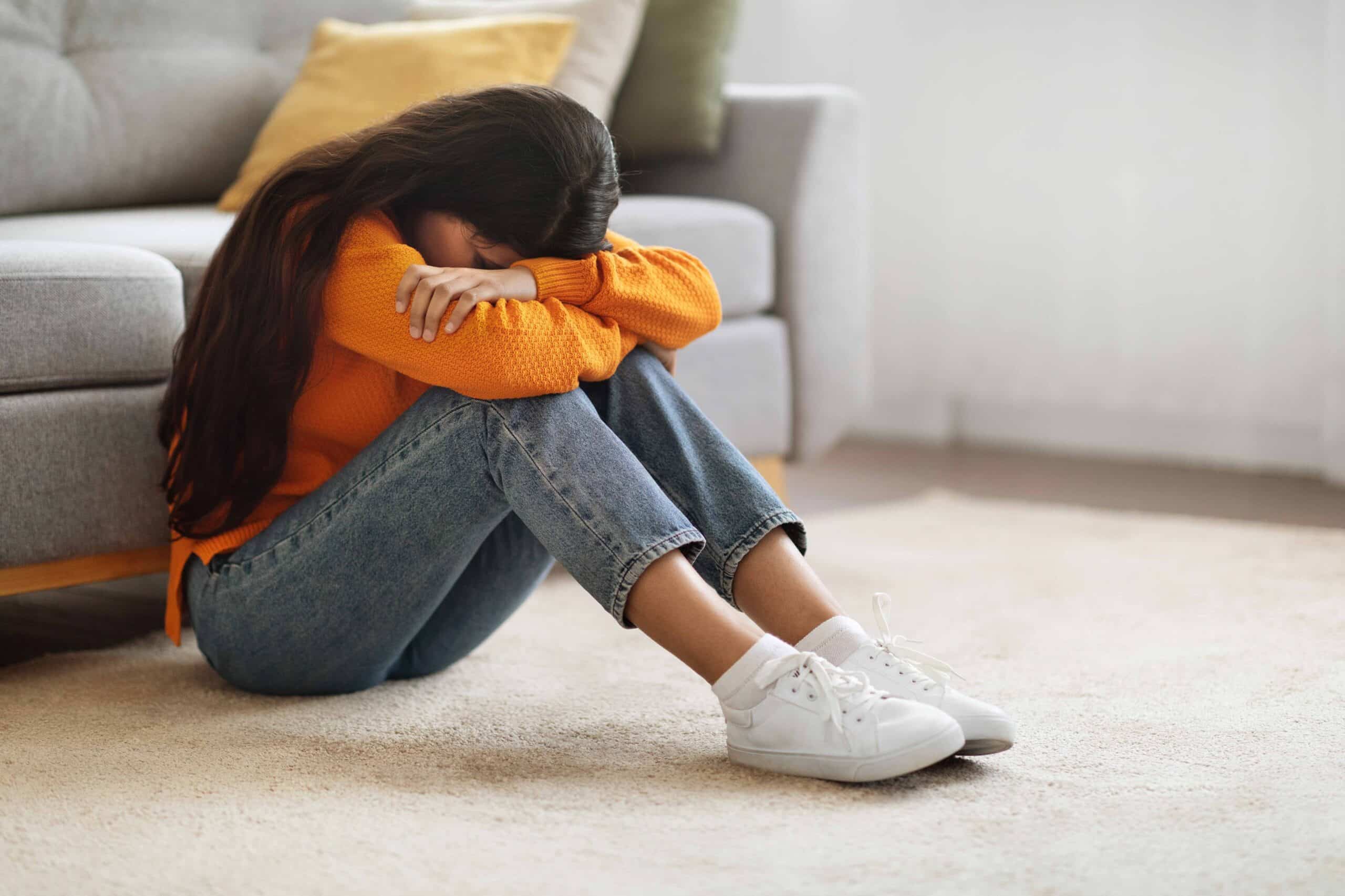 - Depression concept. Portrait of upset young middle eastern woman crying at home, depressed millennial lady burying head in knees, sitting on floor in room, suffering mental breakdown, copy space