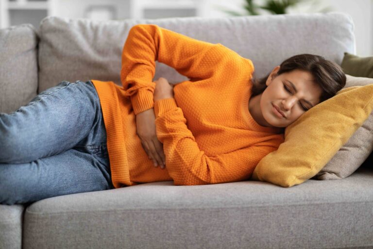 - Sick unhappy young indian woman in casual suffering from stomach-ache, lying on sofa at home, holding tummy, undergoing belly pain and discomfort, suffer from menstruation cramp, copy space