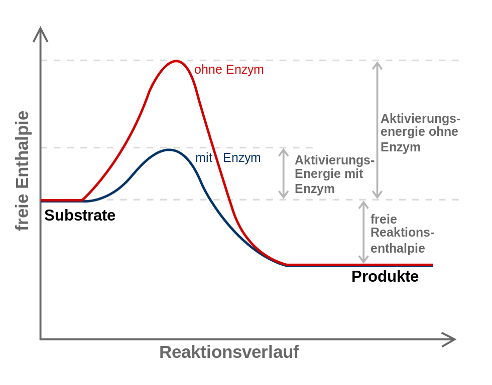 Abbildung 1. Wirkmechanismus von Enzymen: Enzyme wirken wie Biokatalysatoren. Sie ermöglichen Reaktionen, die sonst eine sehr hohe Aktivierungsenergie benötigen würden. Enzyme werden in Folge dieser Reaktion selber aber nicht verbraucht und stehen sofort nach der Reaktion wieder zur Verfügung.