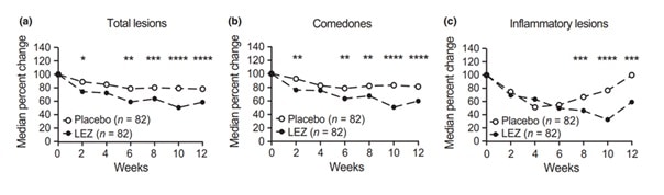 Von 168 Teilnehmern schlossen 164 die Studie ab. Die LEZ-Gruppe zeigte bereits nach zwei Wochen eine signifikante Reduktion der Gesamtläsionen (-14,5 %; p = 0,012), mit einem Maximum von -28,5 % in Woche 10 (p < 0,0001). Komedonen und entzündliche Läsionen reduzierten sich ebenfalls signifikant (bis -44 %). Frauen profitierten stärker und früher als Männer. Sebum-Werte reduzierten sich leicht bis Woche 12 (-6,2 %, p = 0,031). Es traten keine unerwünschten Ereignisse auf.