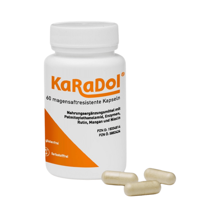 KaRaDol® unterstützt deinen Körper auf natürliche Weise und kombiniert die Kraft pflanzlicher Enzyme mit hochaktivem Palmitoylethanolamid (PEA) und Rutin und versorgt dich mit den wertvollen Mikronährstoffen Niacin und Mangan.