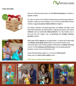„Im Namen der Gemeinschaft von Wairaka und der Bugiri School möchte ich euch herzlich danken. Eure Unterstützung hat vielen Familien geholfen, Weihnachten mit Würde und Freude zu feiern. Ihr habt Hoffnung und Erleichterung in viele Haushalte gebracht – besonders zu jenen, die am verletzlichsten sind.“